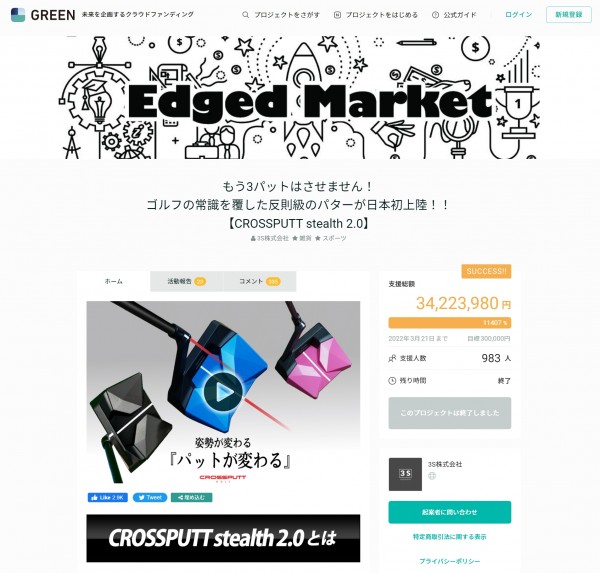 CROSSPUTT 크로스펏의 신모델인 스텔스2.0 Stealth2.0모델은 한국에서 와디즈 크라우드펀딩에서 1억이상의 펀딩으로 고객만족도 브랜드만족도에서 5.0점 만점을 받으면서 서포터들의 검증을 통해 리워드의 품질을 인정받어 일본 크라우드펀딩(Green funding) 에서 골프클럽 퍼터의 단일 품목으로 역대 최고의 기록을 달성하며 (펀딩가 3억5천만원) 성공적으로 펀딩을 종료하여 일본 서포터들의