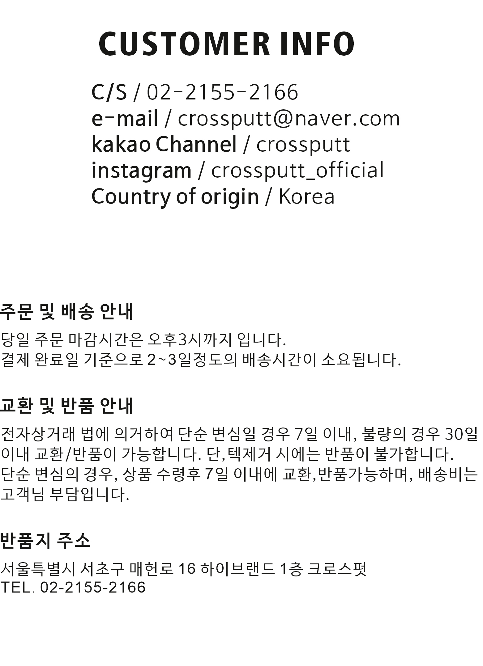* CROSSPUTT의 제품인 경우라도 본사 와 본사가 인정한 오프라인매장업체 에서 유통시킨 제품이 아닌 경우에는 A/S가 불가능 하며 CROSSPUTT의 정품클럽인 경우라도 구매일을 확인 할 수 없는 경우에는 유상 A/S로 처리됩니다.
