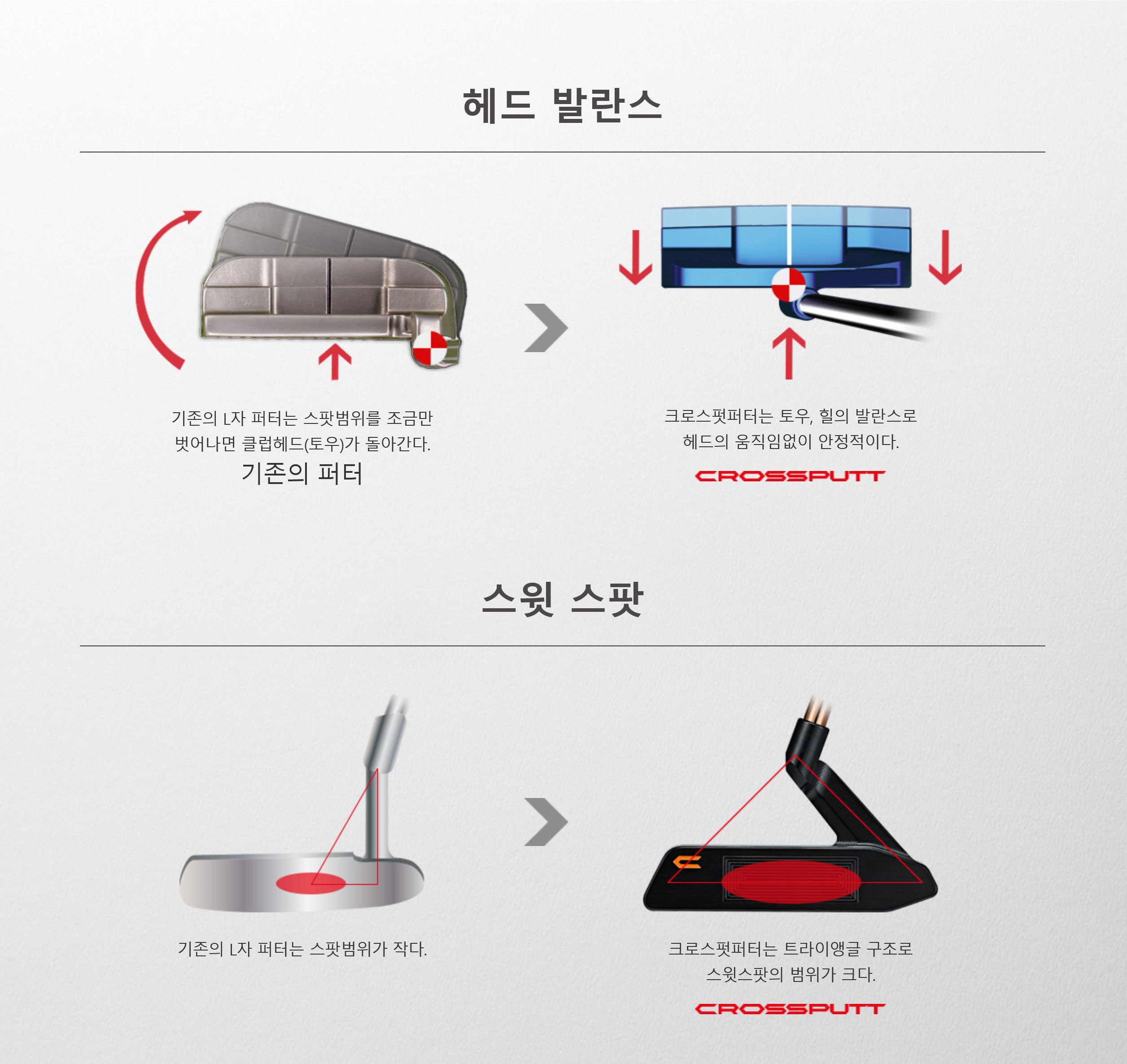 * CROSSPUTT 퍼터는 디자인적 요소로 블랙컬러의 Identity를 가지고 있으며 도장 특성상 사용시 취급법에 따라 마모가 발생할수있으며, 색상으로 인해 마모나 스크러치 발생시 타사 제품보다 조금 더 부각될 수 있고, 헤드 교체를 원할시 유상A/S가 가능합니다.